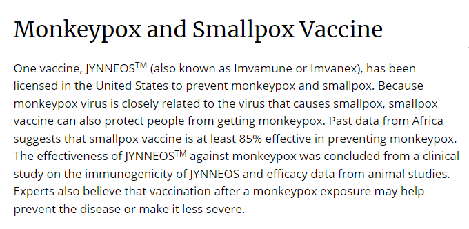 德克萨斯州立大学临床实验科学董事教授Rodney E. Rohde表示,有证据表明天花(与猴痘相关)疫苗可以“帮助预防猴痘感染并减轻症状的严重程度。”据美国CDC,一款叫做JYNNEOS(亦作Imvamune或Imvanex)的疫苗可以预防猴痘和天花。