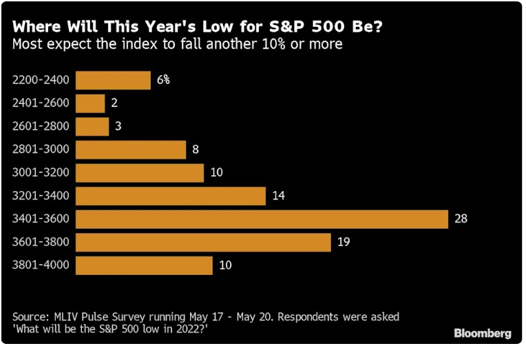 甚至还有不少投资者继续看跌今年股市。据彭博,参与最新MLIV Pulse调查的人士认为标普500指数还将下跌。根据1,009名受访者的预测中值,标普500指数今年可能会继续下跌、可能在3,500点左右见底——这意味着该指数可能较上周五收盘的3,901点再跌至少10%、较1月的高点回落下跌27%。