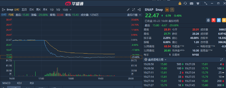 Snap(SNAP.US)在美股盘后更新最新业绩指引之后,其股价在盘后暴跌近30%。该公司警告称,预计第二季度营收和调整后EBITDA将低于一个月前的低区间指引值。截至发稿,该股盘后跌31.24%至15.450美元。
