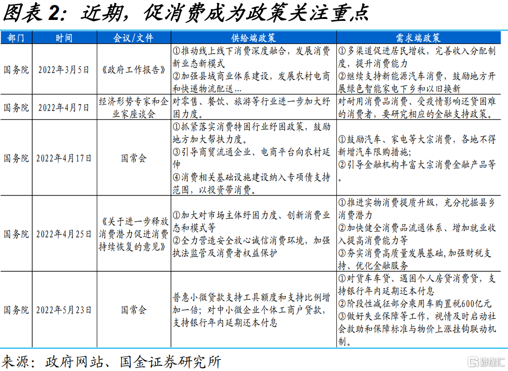 近期,中央部署促消费措施,从供需两端促消费。4月以来,国务院多个会议强调促消费、4月底专门出台促消费相关意见,按照促消费的方式可分为需求端和供给端措施,需求端措施包括,消费券、消费补贴、汽车购置税减免等直接措施,及稳就业、增加收入提高消费能力等间接措施;供给端措施包括,尽可能降低疫情对线下活动的影响,及加强县域商业体系建设、专项债支持消费基建等。