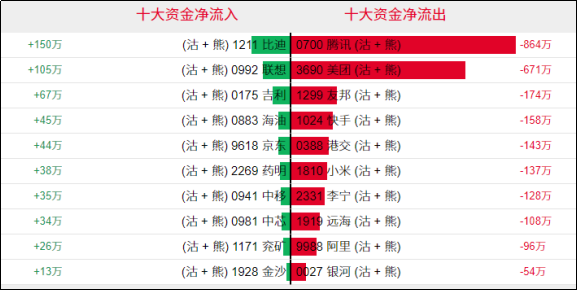 淡仓(认沽证及熊证)方面,周一比迪、联想相关淡仓单日分别录得约150万、105万港元资金净流入;相反,腾讯、美团、友邦相关淡仓单日分别录得约864万港元、671万港元、174万港元资金净流出。
