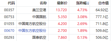 中国国航涨超3%,中国南方航空股份涨超2%,中国东方航空股份涨超1%,国泰航空跟涨。
