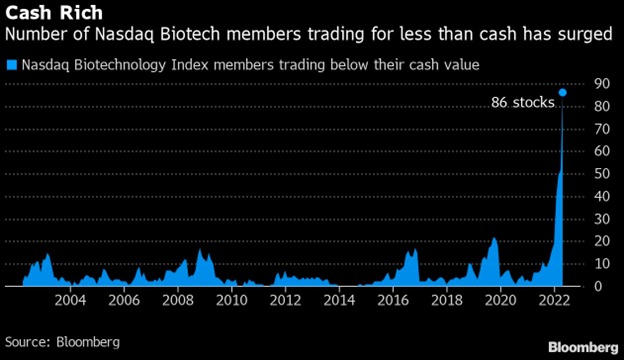Bloomberg最近的调查发现,目前有86只纳斯达克生物科技指数成分股的股价低于其现金价值。