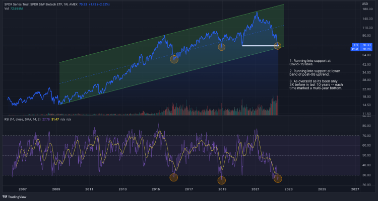 第二,XBI自2008年金融危机以来整体呈上升趋势。这个趋势区间的支撑位正好和上述的疫情低点支撑线大致重合,因此Lango认为这意味着该ETF处于一个“双重强支撑”点位附近。