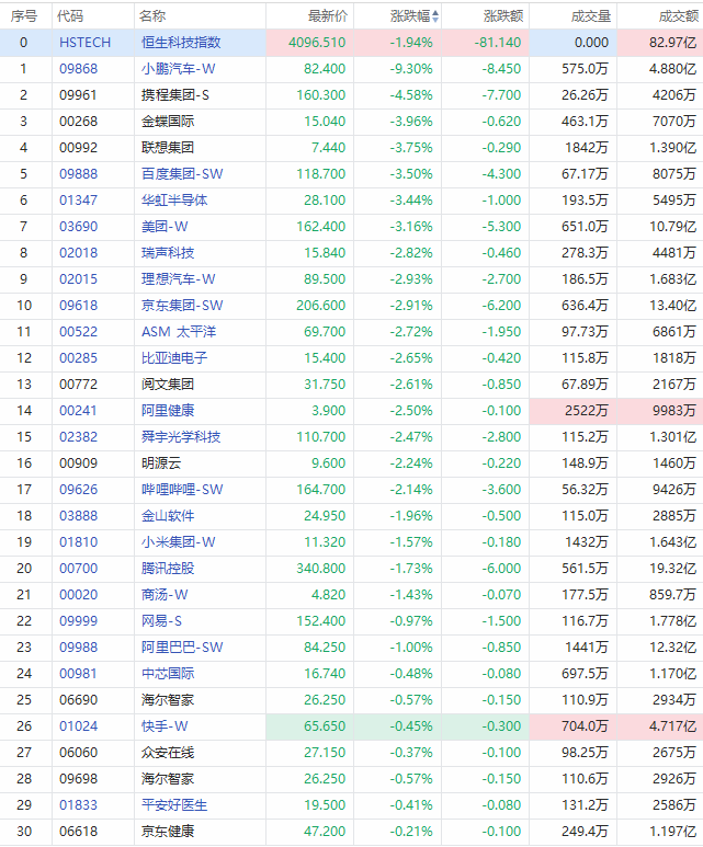成分股方面,汽车股走弱,小鹏汽车跌超9%,报82.4港元每股,理想汽车跌近3%。