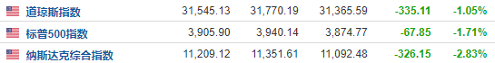 截止发稿,纳指跌2.83%,先前一度跌超3.3%,标普500指数跌1.71%,道琼斯指数跌1.05%。