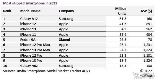 相对而言,这些营销手法与后发技术,行业壁垒较低,很容易形成同质化竞争。2021年出货机型也能印证这一点,销量前十的机型且ASP定价高于600美元的机型,全部来自苹果。