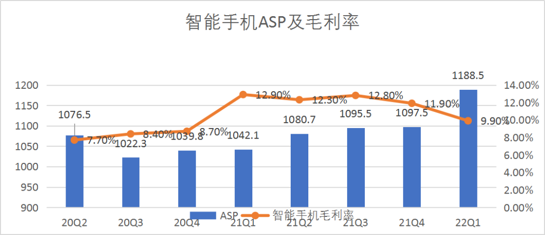 毛利率的问题也较为突出。小米手机高端化战略,使得智能手机ASP(平均售价)由20年Q3低点1022.3元,逐步爬升至一季度的1188.5元。去年拆分后的智能手机业务毛利率得益于ASP的提升,由20年Q2的7.7%逐步爬升至12%以上,但是今年一季度智能手机毛利率仅有9.9%,明显ASP的提升没有带动毛利率增长。