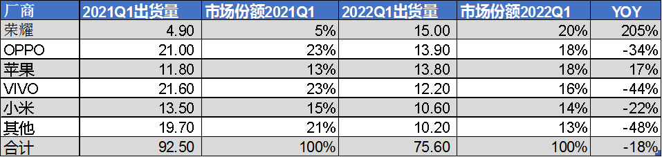 再看国内市场的情况,根据Canalys发布2022一季度中国市场智能手机出货量统计,荣耀今年一季度的出货量YOY(年度增速)达到了惊人的205%,市场份额也从5%迅速增长到20%,超越了小米。也就是说,除了前方三星苹果两座大山,来自后浪的强冲击也不可忽视。