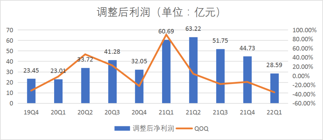 Q1营收733.52亿,毛利127.1亿,较去年同期分别下降4.59%和10.25%。一季度QoQ(季营收成长(衰退)率)为-36.08%,19年四季度以来最低值,增速明显放缓,也是自上市以来首个季度“负增长”