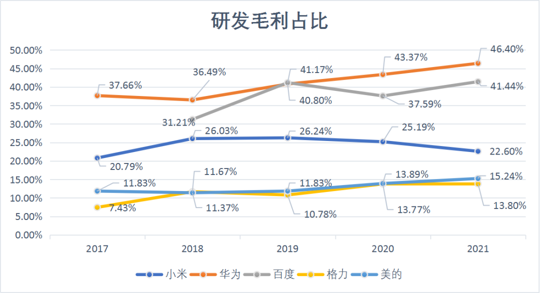 从图中能看到无论是华为还是百度,更愿意拿赚到的钱投入研发中,研发毛利占比达到了40%以上。而小米却投入趋缓,2021年年报显示占比仅为22.6%,从曲线上看,反而有趋近于传统制造业公司格力和美的的趋势。