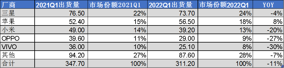 据Canalys发布2022一季度智能手机全球出货量统计,除去TOP5厂商之后的市场份额分别为28%及同期的27%,基本符合了“二八”稳定,行业的集中度提升逻辑已经耗尽。第一的三星和第二的苹果,这两位老大哥的份额还在逆势上升,而小米、OPPO和VIVO份额略有下滑。