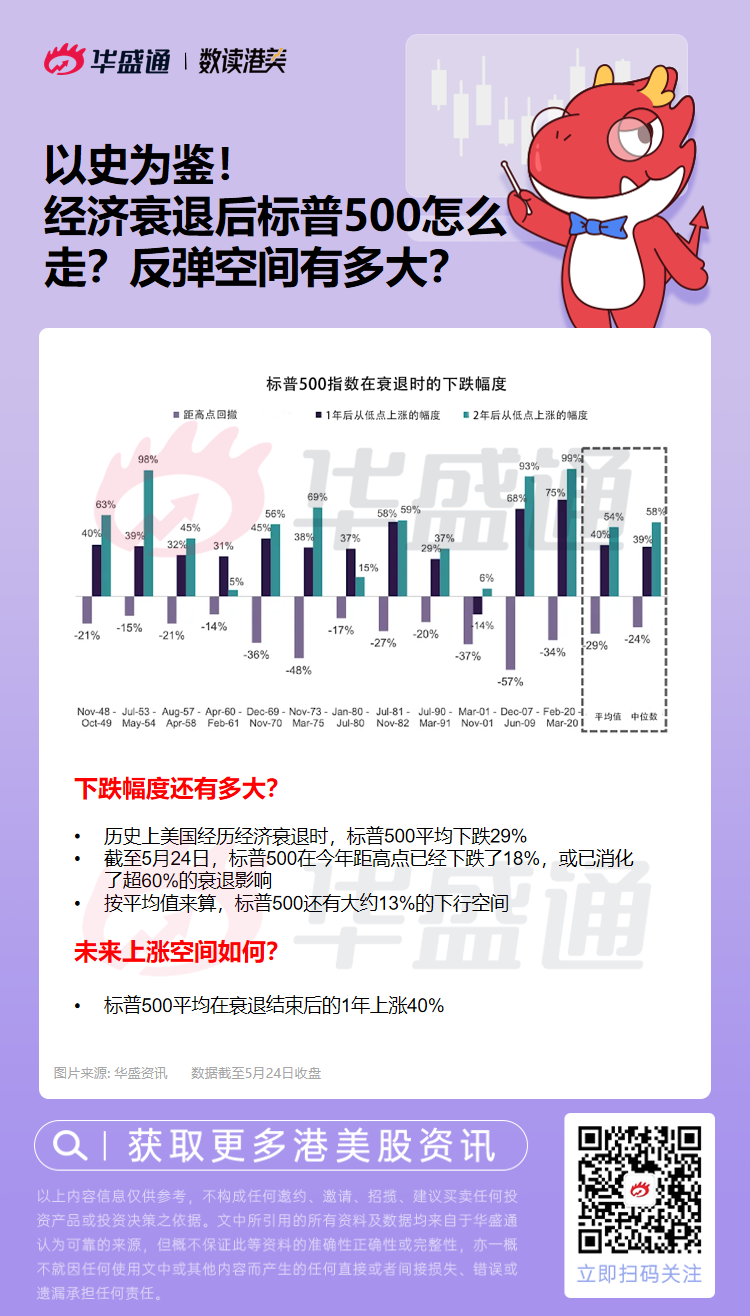从历史上看,标普500指数在美国经济衰退期间平均下跌29%,中位跌幅为24%。