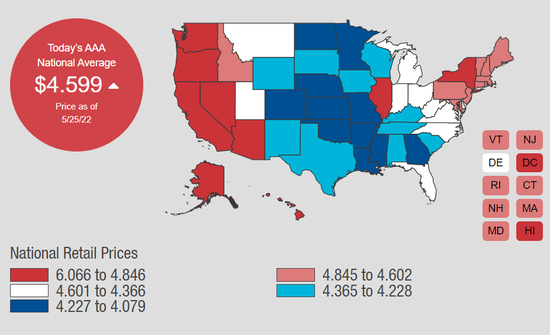 根据美国AAA天然气价格网的数据,美国当前平均汽油价格在4.599美元,较一年前上涨了51.5%,较一个月前上涨了11.5%。
