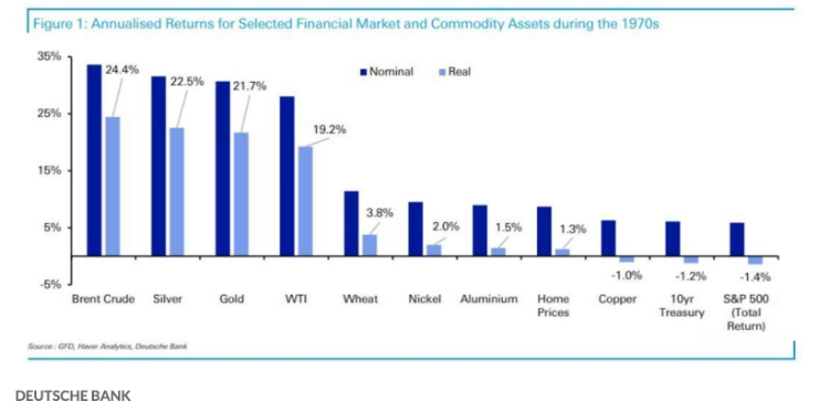 德意志银行在周二发布的一份的报告中,汇总了20世纪70年代滞胀时期一系列资产的表现。分析师指出,如果通胀持续十年,对于债券和股票等传统金融资产投资者而言,能预期到的是“一场真正的财富毁灭”。