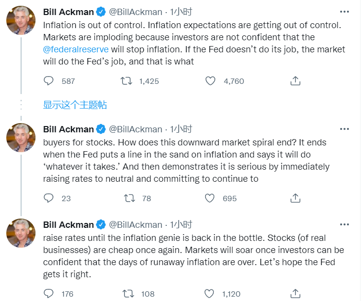 美股周二再度剧烈波动,知名投资者人、潘兴广场基金创始人比尔·阿克曼“喊话”美联储:赶紧麻利加息,否则市场只能通过崩盘来解决通胀问题。他表示,美国的通胀和通胀预期正在失控,市场正在崩溃的原因是投资者对美联储阻止通胀缺乏信心。