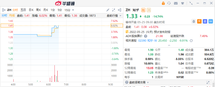 周三美股盘前,知乎公布了一季度业绩,Q1营收7.432亿元,上年同期4.783亿元,市场预期7.22亿元;毛利润为人民币3.355亿元,同比增长23.1%;平均月付费会员数量为690万,同比增长72.8%;拟在未来12个月内回购至多1亿美元的股票。财报发布后,知乎美股盘前走高,截至北京时间18:33,涨幅扩大至6%。