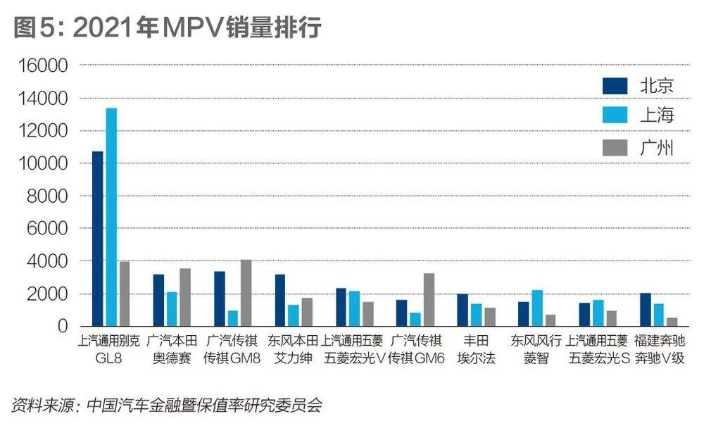 在北京和上海,GL8过去一年分别售出10701辆和13348辆,是第二名的3.2倍和6倍之多。但在广州,GL8只有3986辆的销量,不及广汽传祺GM8,后者以4108辆的销量成为2021年广州最畅销的MPV车型。