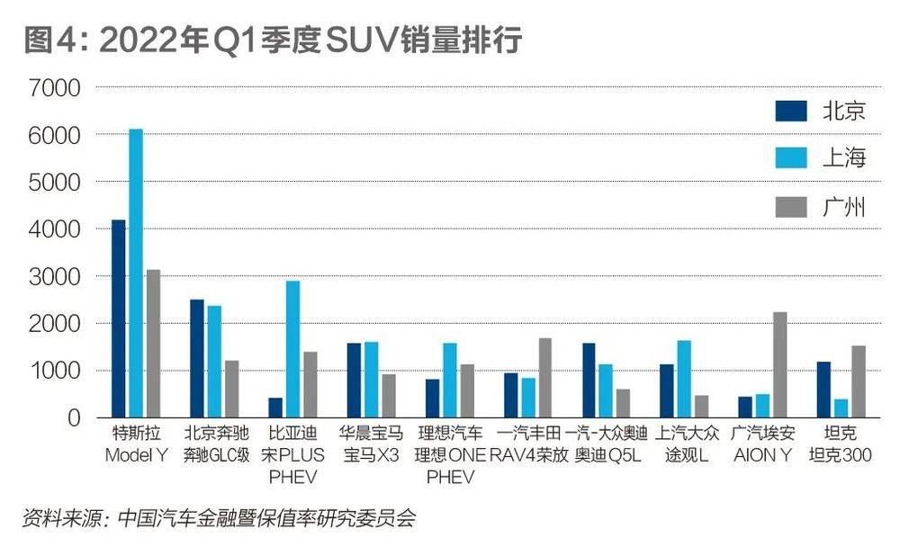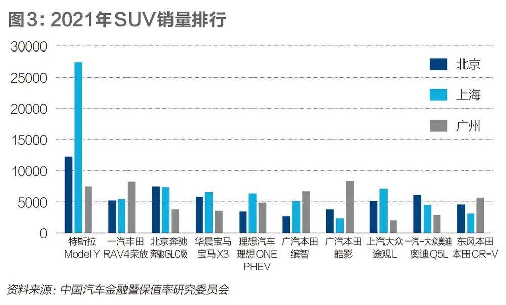 同样的故事也发生在SUV市场。特斯拉Model Y售价约30万元,2021年在上海的销量为27455辆,是第二名荣威eRX5(12057辆)的两倍还多。虽然Model Y在北京同样排名SUV销量第一(12270辆),但销量甚至不到上海的一半,更不必说广州(7401辆)。
