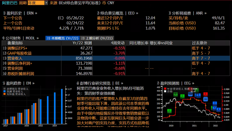 阿里巴巴财年为每年的4月1日至第二年的3月31日,最新披露财报所属2022财年Q4财报(2022年1月至3月)将于5月26日美股盘前发布。根据彭博分析师的一致预期,2022财年度,阿里巴巴营业收入约8502亿元人民币(单位下同),同比增长18.5%,调整后净利润约1317亿元,同比下降26.3%,调整后EPS为47.27元,上年同期数据为65.15元。