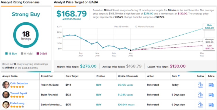 总体而言,尽管阿里巴巴在短期遭遇困境,但是华尔街仍看好这家中国电商巨头前景,据TipRanks的统计,该股票拥有18次买入的一致评级,综合目标价168.79美元,较最新收盘价拥有超过100%的增长潜力。
