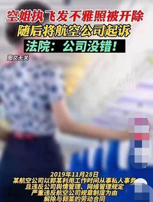 这条朋友圈在发出十分钟后,就被郭某删除了。但是这个时候已经有很多人看到这条,并且进行了转发,还被同事截图举报。所以在一个半月后,南方航空和郭某解除了劳动合同,原因就是她在工作时间拍摄的这张照片,违反了公司的管理规定,而且这张不雅照片违反了公序良俗造成了一定的不良影响。