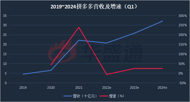 2019~2024拼多多营收及增速(Q1)预测(数据来源:彭博)