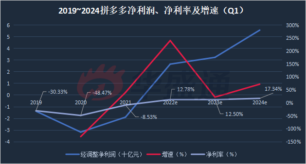 2019~2024拼多多净利润、净利率及增速(Q1)预测(数据来源:彭博)