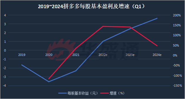 2019~2024拼多多每股基本盈利及增速(Q1)预测(数据来源:彭博)