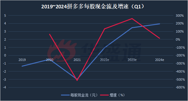 2019~2024拼多多每股现金流及增速(Q1)预测(数据来源:彭博)