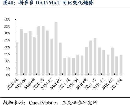 华泰证券则认为,拼多多在高频生鲜类别中的竞争优势以及高效的产品推荐机制,可以支持货币化改善。根据 QuestMobile 数据,拼多多的 DAU/MAU 比率在2022年2月为61.6%,无论是比率还是同比增速,在同行业头部玩家中都处于领先位置。