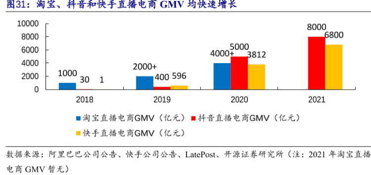 淘宝、抖音和快手直播电商GMV增长趋势(来源:公司公告、LatePost)