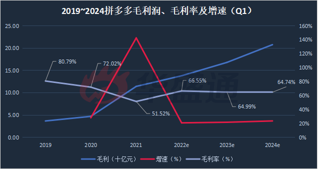 2019~2024拼多多毛利润、毛利率及增速(Q1)预测(数据来源:彭博)
