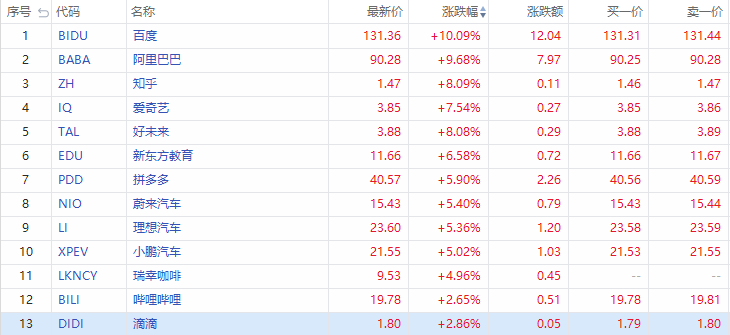 知乎(ZH)、好未来(TAL)涨超8%,爱奇艺(IQ)涨近8%,新东方(EDU)涨近7%,蔚来汽车(NIO)、小鹏汽车(XPEV)、拼多多(PDD)、理想汽车(LI)涨超5%,滴滴(DIDI)、哔哩哔哩(BILI)涨超2%.