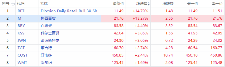 梅西百货涨超13%,诺德斯特龙上涨超3%,科尔士百货涨3%,好市多、塔吉特涨2%,沃尔玛跟涨。