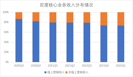 从2020年第三季度开始,百度核心业务中的广告和非广告收入分别披露。到2022年第一季度,非广告收入对百度总营收的贡献比例逐渐提升,最新的贡献比例更是从去年同期的20.5%,大幅提升至26.6%。