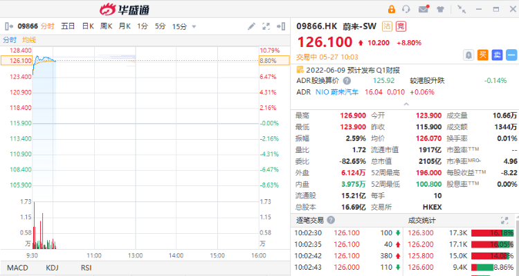 华盛资讯5月27日讯,港股新能源汽车股早盘集体走高,截至发稿,蔚来涨近9%,报126.1港元。