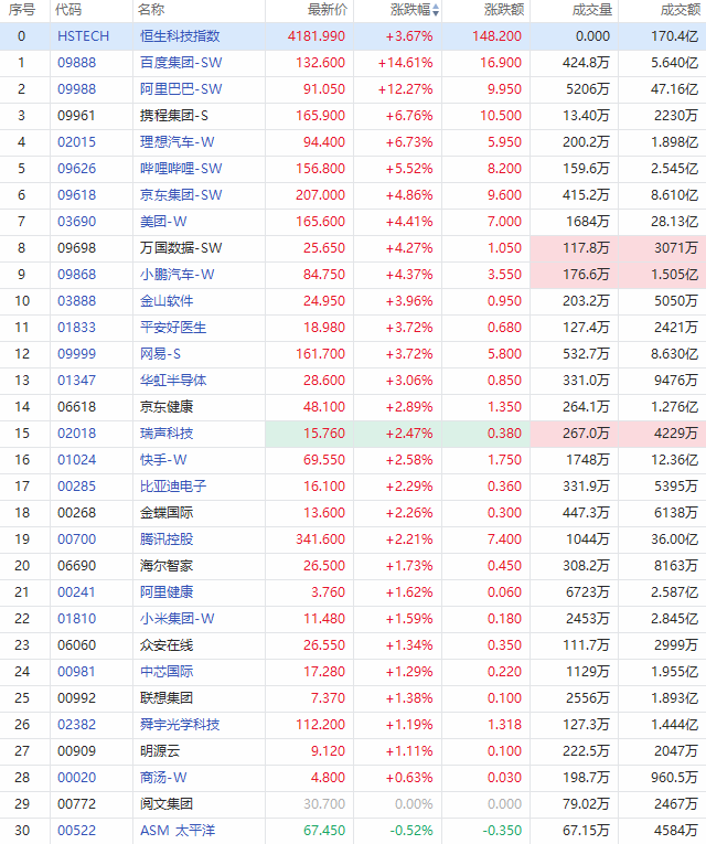 科网股集体拉升,百度涨超14%,阿里巴巴涨超12%,理想汽车涨逾6%,哔哩哔哩涨超5%,京东、美团、小鹏汽车涨超4%,网易涨逾3%,快手、腾讯涨逾2%。