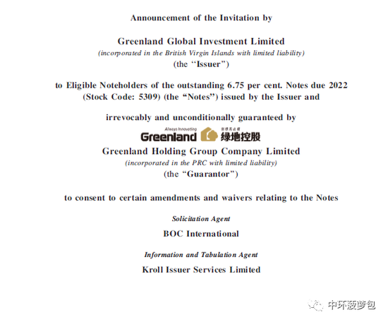 上午绿地控股集团有限公司发布公告称,受疫情及行业逆风影响,为改善公司的现金流和流动性,发行人Greenland Global Investment Limited和担保人绿地控股集团正在征求GRNLGR 6.75 06/25/22(ISIN:XS2016768439)持有人对拟定契约修订和豁免的同意,包括延长票据的到期日、加入发行人在到期前赎回全部或部分票据的赎回权、先行支付原到期日未偿还本金的10%。