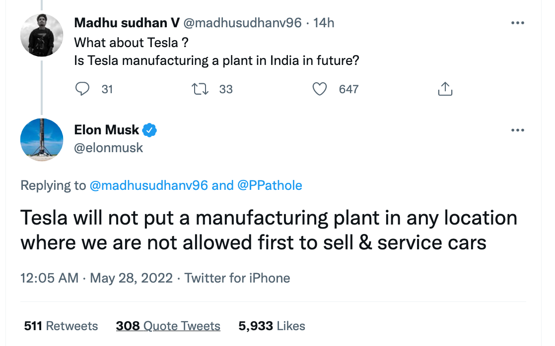 当一名粉丝在推特上询问特斯拉在印度建厂的最新情况时,马斯克回应称:“特斯拉不会在任何不允许我们销售汽车和提供服务的地方设立制造厂。”