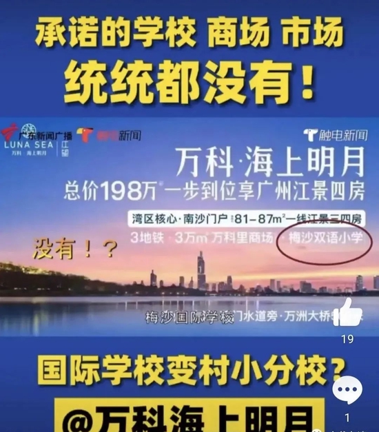此事不是我们业主恶意捏造,而是有高达30万播放量的万科官方售楼人员直播卖楼视频作证、有万科铺天盖地的各种宣传手册/海报/灯牌/物料等作证、有一千八百多户海上明月业主作证、有如今已荒凉的万科里商场和菜市场作证。