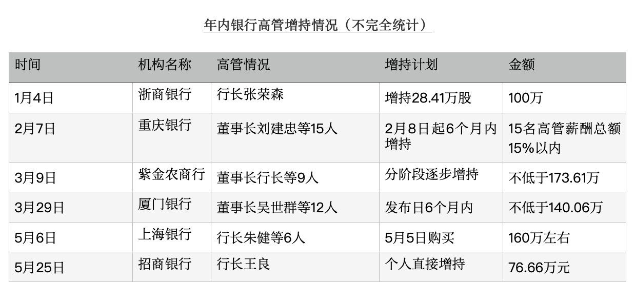 “最近几年高管增持现象确实是比较多的,各家都在做。核心的原因是大周期不好,市场对银行股的信心在下降,高管增持至少能向市场释放信号,那就是管理层对未来有信心,也是监管鼓励的一个方向。”一家头部城商行董办负责人对财联社记者表示。