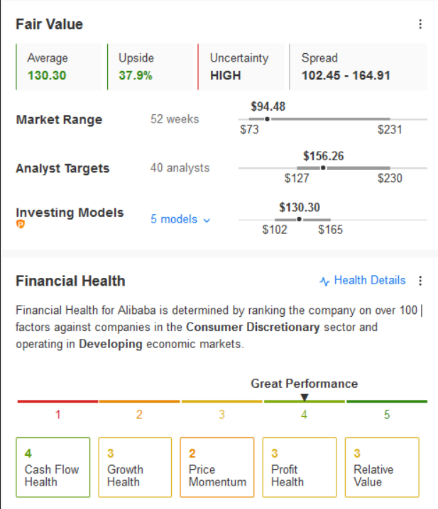 InvestingPro的模型显示,阿里巴巴的公允价值为130.3美元,较当前价格高出37.9%,华尔街分析师未来12个月的平均目标股价为156.26美元,较当前股价高出65%。其财务健康状况评分为4分(总分5分),非常优秀。
