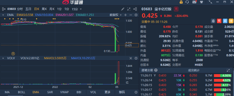 华盛资讯5月30日讯,荣丰亿控股(03683)公布,对于呈请人申索有关可换股债券的尚欠债项合共5123万美元,该公司仍在就还款与呈请人磋商,以期就新的还款条款达成共识。截至发稿,涨超220%。