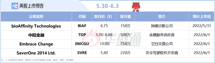 截至目前,本周美股IPO市场暂时预计将迎来4只新股挂牌。其中包括来自中国香港的金融服务供应商中阳金融集团和安全驾驶软件开发商SaverOne。