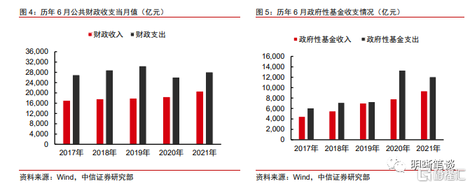 6月财政通常“支大于收”,考虑积极的财政政策下,将采取留抵退税、减税降费和扩大专项债投资等措施拉动经济增长,预计财政支出将进一步发力,收支差额较历史平均水平进一步扩大。参考往年情况,6月通常支大于收。如果假定公共财政收入支出以及政府性基金收入支出均延续近两年的复合增速,则测算结果显示,2022年6月广义财政收入总额大约3.34万亿元,支出总额4.14万亿元。然而,从5月公布的相关经济金融数据来看,我国经济运行面临许多不确定性和挑战。近期,国常会要求在更多行业实施存量和增量全额留抵退税,增加退税1400多亿元,全年退减税2.64万亿元,力度超过2020年。同时,支出方向会更加向保市场主体、保就业和保民生领域倾斜。基建投资可能是主要的宽信用方向,这也符合“全面加强基础设施建设”的要求。总体来看,我们调高财政收支差额预测,预计6月广义财政收支差额约-15000亿元。