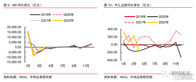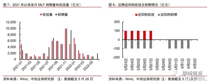 M0变化较为平稳,存款准备金缴纳压力较4、5月有所增加。5月人民币汇率承压,对流动性带来一定的扰动,但相较于政府债融资或财政收支等因素影响依然较弱,预计6月变化幅度也不会超过300亿元。流通中的现金M0具有很强的季节性,但往往体现在一季度(受春节时间点影响),由于居民有取现需求,M0会增加,流动性收紧,节后又会恢复,其他时点基本波动不大。2019、2020和2021年的6月,M0平均减少100亿元。同样的,参考2019-2021年同期情况,6月份扣除非银同业存款的人民币存款通常增加35000亿元,这可能与半年末银行加大揽储力度有关,假设平均法定存款准备金率仍为8.1%,则法定存款准备金将需要补充缴纳2800亿元,较4、5月明显提升,对流动性带来一定的压力。
