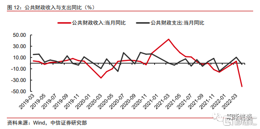 4月短期退税、减税压力较大,叠加疫情影响,财政收入明显下滑,间接导致财政支出有所减速。近期国常会要求在更多行业实施存量和增量全额留抵退税,增加退税1400多亿元,全年退减税2.64万亿元,力度超过2020年。据财政部副部长许宏才介绍,4月增值税留抵退税规模约8000亿元。降费方面,国常会要求将中小微企业个体工商户和5个特困行业缓缴养老等社保费政策延至年底,并扩围至其他特困行业,预计今年缓缴3200亿元。大规模的减税降费导致财政收入大幅下滑,在一定程度上限制财政支出,4月财政支出同比下降2%。在有限的财政资源下,支出方向会更加向保市场主体、保就业和保民生领域倾斜。后续若想保证支出强度,还需要进一步“开源”。