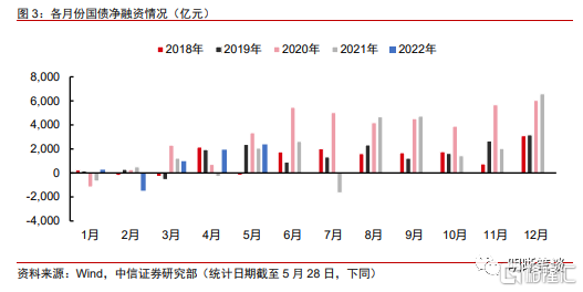 地方债方面,专项债券发行提速,参考目前公布的地方债发行计划,预计6月地方债净融资可能达到15500亿元,或成为地方债有史以来最大单月净融资额。据21世纪经济报道,多位地方财政系统人士处消息,五一假期期间,监管部门紧急通知地方,要求地方进一步加快专项债发行节奏,2022年新增专项债券须于6月底前基本发完。今年以来,地方政府债回归前置模式快速发行,落实积极财政政策,带动扩大有效投资、稳定宏观经济。截至5月28日,江苏、山东、云南等多地已经发布了2022年6月地方债发行计划。根据计划,6月将发行地方专项债和一般债合计约9000亿元,而wind统计6月地方债到期规模4343亿元。考虑到目前部分地方政府,尤其是部分发行大省如安徽等未公布发行计划,统计数据并不全面,假设21世纪经济报道属实,预计最终地方债净融资可能达到15500亿元。