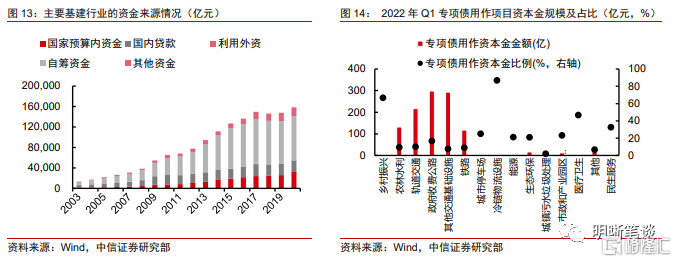 近年来基建项目对于国家预算资金的依赖程度增大,政府性基金需要借助专项债向基建投资发力,从而达成“稳增长”的政策目的,其中专项债对于拉动项目投资发挥了重要的撬动作用。从国家统计局公布的基建三大主要行业历史资金来源情况来看,基建资金来源中以自筹资金为主,但占比有所下降;国家预算内资金(一般公共预算、专项债和各类政府性基金)规模与占比却在持续升高。2022年一季度,共有339个项目将专项债用作资本金,项目涉及交通基础设施、农林水利等方面,总投资达到26373亿元。其中,用作资本金的专项债规模达到1126亿元。不难看出,专项债对于拉动项目投资发挥了重要的撬动作用。